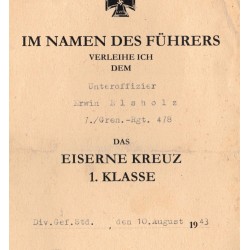 Attestato di conferimento di croce di ferro di 1a Classe del Agosto 1943