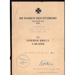 Attestato di conferimento di croce di ferro di 2a Classe del Giugno 1943