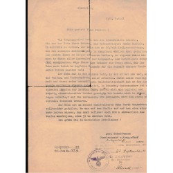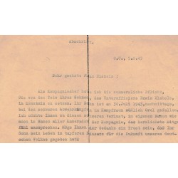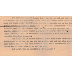 Molto interessante e struggente la lettera del suo Comandante inviata alla madre del ragazzo nella quale racconta con dovizia di particolari l azione di guerra durante la quale il Sottufficiale perse la vita , inoltre nel lotto vi e' la lettera del 10/08/43 in cui gli viene conferita la croce di ferro di 1a classe , in pratica alla memoria , con altre parole di elogio per il figlio .