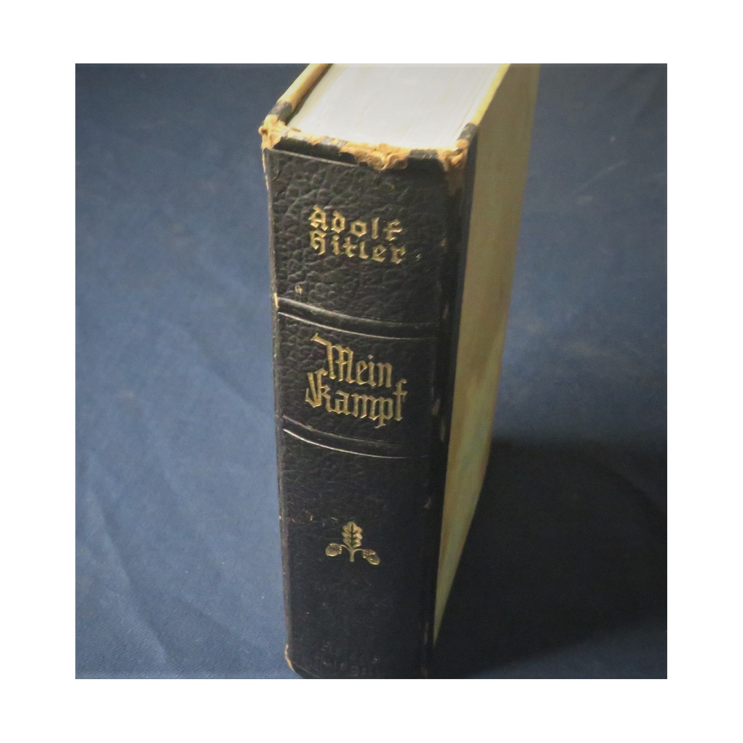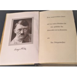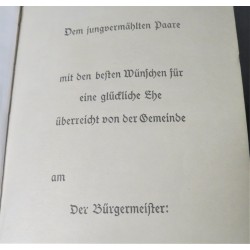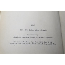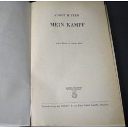 Interessante edizione del Mein kampf con la pagina che in occasione delle nozze fra due membri o del NSDAP o delle SS veniva compilata e firmata dal Borgomastro della citta o paese dove i giovani si sposavano , in questo caso la pagina e' bianca in quanto con tutta probabilita' trattasi di una copia rinvenuta in qualche negozio d epoca.