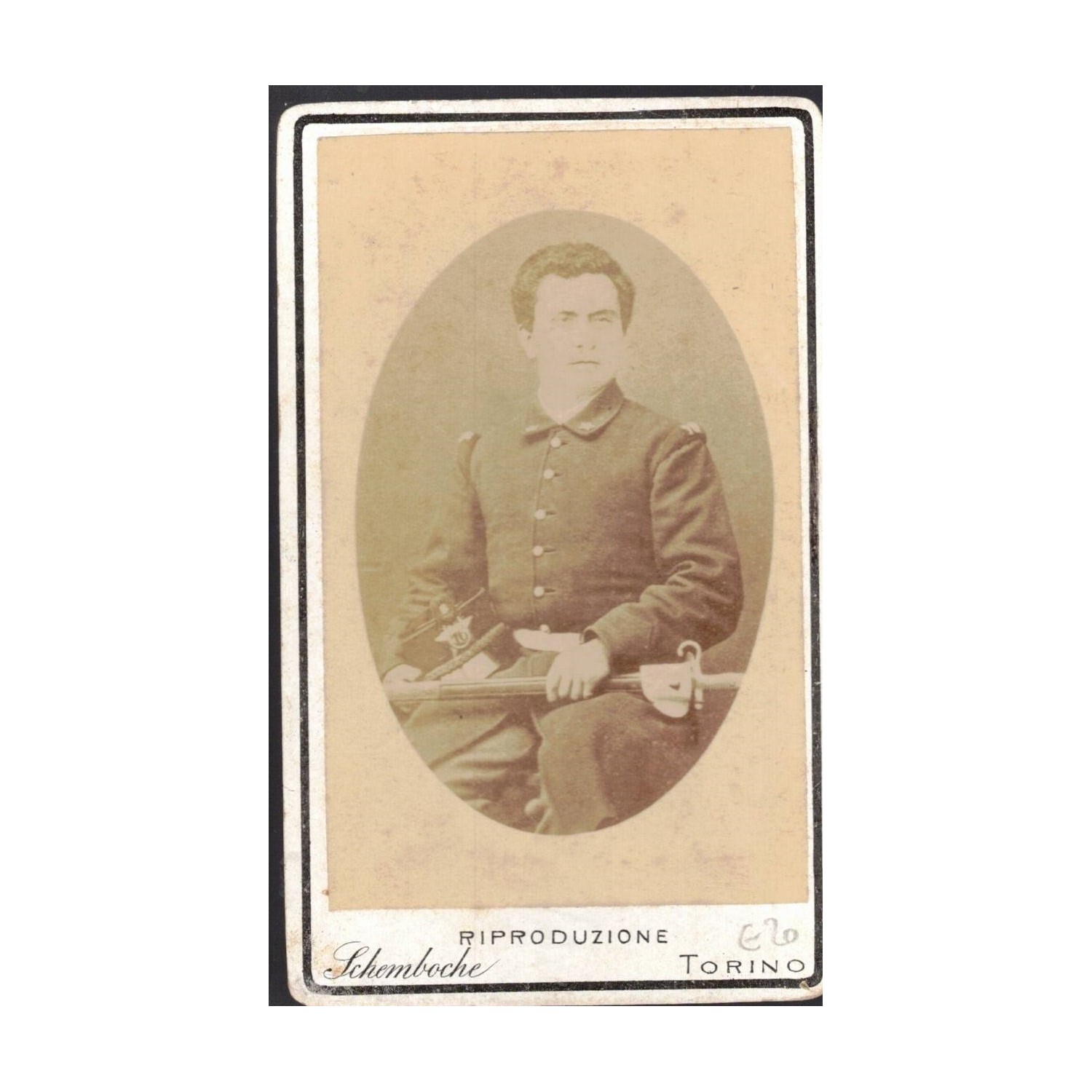 Photo in card-de-visit format of a soldier of the 16th Rail Artillery Regiment, interesting because the photo shows that the soldier has on his legs the 1874 vetterli bayonet sabre with metal hilt