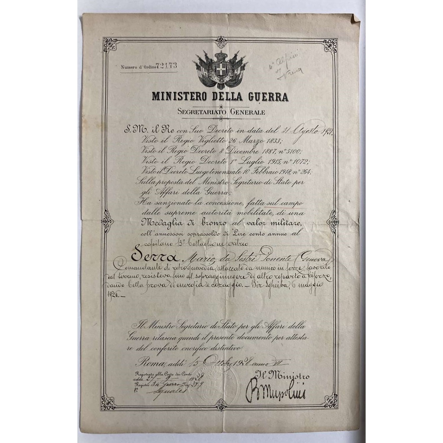 The medal of Valor was awarded for war action at Bir Sgheiba on May 6, 1926