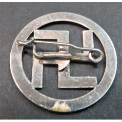 Nice badge in nickel-plated sheet, a swastika inside a circle, back pin attachment